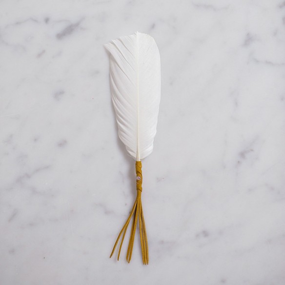 Bird feathers are traditionally used in smudging ceremonies to fan the smoke into the space or over the person or object being cleansed. Our smudging feather is crafted with intention, prayer, and incense burning by David Guitierrez, a spiritual leader and medicine man from Mexico, in the Teocalli Quetzaltcoatl tradition. The materials used in the feather arrangement—a cockatoo feather, a quartz crystal, and a deer leather tassel—are powerfully symbolic, representing the connection between Mother Earth (the deer, a sacred animal in native traditions) and Heaven (the feather from a cockatoo, a species known for being especially loving), with a beating heart between Earth and Heaven (the quartz crystal).