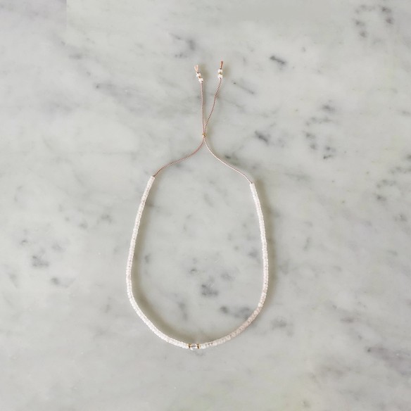 Natural semi-precious gemstones of rose quartz and clear quartz, 14k gold-filled accent beads, German silk cord, 14k gold-filled adjustable slider clasp.