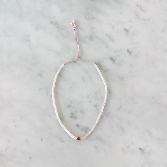 In Latin, “amare” means “to love.” Our beautiful Amare Necklace collection, exclusive to abatey, is created and handmade—with love and intention—by Celi Corchado of My Kavanah. The semi-precious gemstones in each of the seven necklaces are chosen for their healing energies and correspondence to our chakras. The primary beads are rose quartz, which carry the energy of love for humanity and self. Carnelian corresponds to the sacral chakra, or second chakra. The sacral chakra is linked to connection, acceptance of others and of new experiences, and creativity. Carnelian encourages life force and vitality, stimulates metabolism, and boosts fertility.